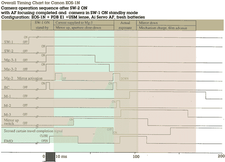 (4) Overall Operation Sequence Overall operation is basically the same as the previous Canon EOS-1. For reference, an overall operation sequence flow chart as well as operation timing chart (52k Gif) for the EOS-1N combined with the PDB-E1 and a typical USM lens is shown in the illustration(s). You may check the electronic section for other related info.