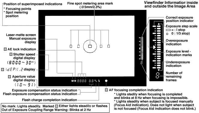 Viewfinder mainly concerns exposure and focusing. Outside the viewfinder information is the same as in the EOS-1 except that exposure level indicator can also indicate the stops in half steps (with Custom Function CF-6 set to 2). Displayed below the viewfinder screen are the shutter speed, aperture, AE lock, in-focus indicator, and other information. On the right of the screen is the exposure level indicator, exposure level scale, and remaining frame counter (for the last 9 frames). These are also the same as in the EOS-1 except now the exposure compensation indicator also functions as an indicator for the newly-added flash exposure compensation feature.