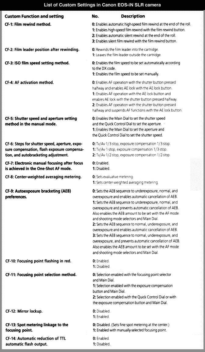Relative: Compared this with the Previous Canon EOS-1 camera's Custom Settings Table.