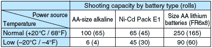 Figures are based on Canon tests using new batteries, an EF 50mm f/1.4 lens, and 24-exposure film. Figures in parentheses indicate the number of 36-exposure rolls. Filmless camera operations and autofocus operations will reduce the above figures.