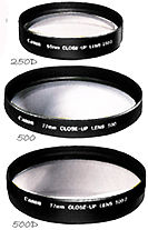A cost-effective and even more versatile close-up method than extension tubes. It is a handy accessories when used in combination with telephoto lenses because you can easily detach them and revert the lenses back as normal lenses, and these are the only close-up accessory that doesn't suffer loss-light on increasing magnification. Further, it serves as a better option if one does do plenty of close-up pictures. They comes in a few diameters to serves variable filter attachment sizes on EF lenses. 52mm, 58mm are the popular ones. Lately, Canon introduced another few sizes like 72mm and 77mm diameter filters. As at 2006, both sizes are for the 500D only. The main difference among them is - 250D is optimized for lenses between 50 and 135mm, while the 500D works best with lenses from 75mm through 300mm. Both have a double-element design, so their optical quality is excellent. The Close-up Lens 500, with a single-element design, offers an even more affordable alternative. Originals are usually more expensive than third party labels, you can try alternatives from popular brands such as Hoya, B&W etc. Note:- The working distance from the end of the lens is 25cm for the 230D and 50cm for the 500(D) at OO. Further, the magnification is higher for the 250D than the comparing 500/500D.