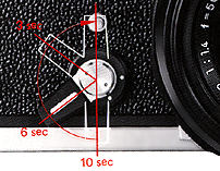Shutter ControlsThe shutter speed selector is on the top deck of the camera close to the prism. The shutter release is on the back edge of the top deck, between the advance lever and the shutter speed selector. Shutter speeds may be selected from B, T, and 1 - 1/1000 sec, with (electronic) flash sync at 1/60th of a second.