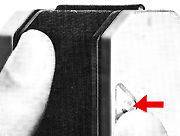 Pull up on the rewind knob (1) and drop a film cartridge into the film chamber with the film leader pointing towards the take-up spool. Now, push down the rewind knob to hold the cartridge in place (2) and insert the end of the film leader into any one of the three slots in the take-up spool. Rotate the take-up spool as shown in the illustration so that the film passes under the spool with its emulsion side (dull side) facing out (See picture at the left hand side below).Make sure that the perforations along the edges of the film mesh with the sprockets.Close the camera by pressing on the back until it snaps into place. Fold out the rewind crank and turn it gently in the direction of the arrow until you can feel a slight tension (illustrated below). This will take up any slack in the film cartridge.