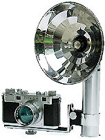 Now you can deploy the reflector by hooking it into one of the two slots. The "nearer" slot (shallow bowl) illuminates approximately a 35mm lens's field-of-view, while the "farther" slot (deeper bowl) illuminates about a 45mm lens's FOV. Of course, you can leave the reflector furled and use bare-bulb flash at a fraction of the cost of a new Sunpak 120J (on the other hand, the Sunpak offers 3 auto-apertures, manual power attenuation, and on one model, TTL flash control).
