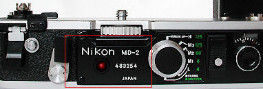 The most noticeable section is at its removable S-C knob. The Shutter release button for MD-1 and MD-2 is significantly different in its shape and design. The button for MD-1 is rectangular shaped while the firing button for MD-1 is a rounded button. The finger rest for MD-2's S-C knob has better human engineering than MD-1. Updated: Check the MD-1 contributed by Mr Tor Lembag shown above, his Nikon MD-1 S/N 201078 shares similar MD-1 shutter release knob design.<<<<<<<<------- Credit: Picture at right courtesy of Edward Ngoh, Pictured by: MCLau®.