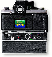 <<< ---- Virtually all Nikon F2 models (except F2H) can be used with MD-2 without any factory adjustment or modifications. Shown at far left is a MD-2's F2 Photomic (w/DP-1 Photomic finder); the left pix is a F2SB (w/DP-3 Finder) . The Power pack for both are a MB-1 battery pack.The MD-2 itself comes equipped with a subtractive frame counter that can be used in two ways. The simplest is to countdown the number of exposures made and then, at the end of the film, to shut the motor drive off automatically. This prevents the film end from being pulled out of the cassette. The other way to use the counter is for presetting bursts, with the motor drive automatically shutting off after the preset number of frames has been fired. As the camera's frame counter continues to function with the motor drive attached, it is easy to keep track of the number of exposures remaining even when shooting in bursts. Film loading and unloading are simple and straightforward with the MD-2 attached. The motor drive simplifies advancing the first few "blank" frames at the start of a new film and its power rewind facility makes very short work of rewinding the film when it is completely exposed, taking a mere 7 seconds for a full 36-exposure cassette.