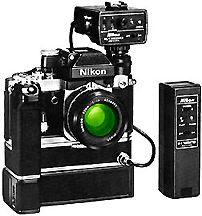 Radio Control Set MW-1 This set, which consists of a compact transmitter and a receiver, provides wireless remote control photography with motorized F2 Nikon cameras. Its multi-channel capacity permits push button operation of up to three cameras, either simultaneously or individually. The cameras can be set for single-frame or continuous operation, depending on the requirements of the shooting situation. Modulite Remote Control Set ML-1 The ML-1 is designed for remote control operation of motor driven F2 Nikon cameras; its twin channels permit the independent operation of two cameras depending on the needs of the shooting situation. The cameras can be set for either single-frame or continuous operation.