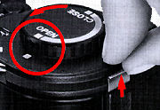To open the cassette, hold it with the "Nikon" name facing up and the cutout of the outer shell facing you. While depressing the release pin on top, turn the inner shell. When the outer shell's cut-out coincides with that of the inner shell, the inner shell slips free, enabling the removal of the spool.