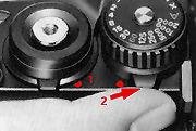 2) Then to recook the shutter without advancing the film, push the multiple exposure lever forward (Fig. 1) and stroke the advance lever. Immediately the multiple exposure lever will spring back to its normal position (Fig. 2).3) Now you are ready to take the second shot on the same frame. For more than two shots on the same frame, just repeat the same procedure for each additional exposure. When you have finished, simply advance the film normally to the next frame. While making multiple exposures, the frame counter does not advance. The multiple exposure setting cannot be cancelled once the lever is set in the out position. Note: If you wish to cancel the multiple exposure setting, first cover the lens with the lens cap and close the eyepiece shutter; then make a blank shot and advance the film to the next frame. Memo Holder