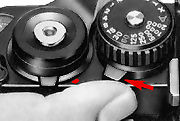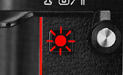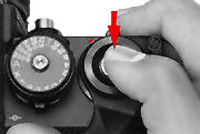 A convenient built-in viewfinder illuminator lets you see the the LCD exposure information and the aperture, even in dim light. To turn on the illuminator, push the red illuminator button located at the base of the viewfinder just in front of the shutter speed dial (72).