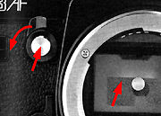 To lock the reflex mirror in the up position, push in the depth-of-field preview button and rotate the lever counterclockwise until it stops. To return the mirror to the "down" position, rotate the lever clockwise until it stops.Caution: With the mirror locked up, you should not operate the camera on automatic. Even though the LCD continues to show you the shutter speed automatically selected by the camera, this speed will not produce the correct exposure. Autofocus operation with the mirror in the "up" position is also impossible.