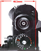 The film plane indicator is engraved in white on the top deck just behind the shutter speed dial. It indicates the exact position of the film plane inside the camera. Whenever it becomes necessary to measure the exact distance between the subject and the film plane, such as in macro photography, use the film plane indicator. The distance between the film plane and the lens mounting flange is 46.5mm.