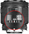 The red dot beside the focusing index on most lenses is the infrared focusing mark. When shooting with black and white (but not colour) infrared film, it is necessary to refocus the lens to compensate for the fact that infrared light rays focus at a point slightly in front of visible light.In infrared photography, use of an R60 filter is required. At first, focus on your subject through the viewfinder by rotating the lens focusing ring (49) without the filter in place. Then look at the lens and take note of the focused distance. Reset the focusing ring so that the desired distance is aligned with the red dot. Finally take the pictures with the filter attached.