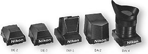 More info: Section on Interchangeable Prisms The camera's autofocus control however, cannot be used with the viewfinders other than the DX-1.The Eye level finder DE-2 offers regular eye level viewing and provides an upright non inverted image in the viewfinder. The High-Eyepoint Finder DE-3 gives you the same eye level viewing, but allows eyeglass wearers and action photographers alike to see the entire frame with the eye up to approx. 25mm away from the eyepiece. The Waist-Level finder DW-3 is ideal when you want to use the camera at a low angle or upside down over your head when shooting over crowds. The Action Finder DA-2 works well for those situations when you cannot bring your eye close to the finder, such as fast breaking sports event, when you are wearing a helmet or goggles, or when the camera is enclosed in waterproof underwater housing. The 6x Magnification Finder DW-4 is for critical high-magnification close-up work or photomicrography. When using the DA-2 or DW-3, be careful that stray light does not enter from the top and cause an inflated meter reading.