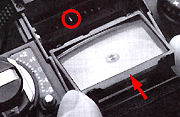 To install a focusing screen, simply insert the front edge (the edge with the slot in the middle) under the pin and push the rear edge of the screen down into place.To take out the focusing screen, first remove the finder, then insert your fingernail under the rear edge of the screen and lift it out.