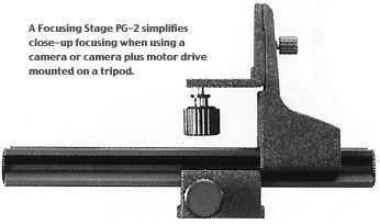 A Bellows Spacer PB-6D enables moving a motor drive camera body like the F3 with MD-4 (Nikon F5, F4E, F4s) on the PB-6 rail without interference. It mounts between bellow standard and rail to provide sufficient clearance. Two are required for operation of the PB-6. An additional spacer is required for both the PB-6E and the PS-6.Having selected your reproduction ratio, you can mount the PG-2 Focusing Stage between the bellows and the tripod and move the complete system back and forth to obtain the sharpest focus. Eliminates any need to modify either lens focus ring or bellows extension.