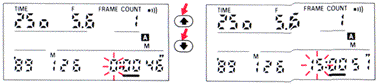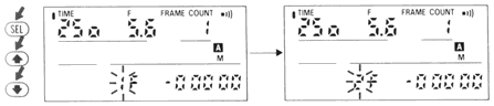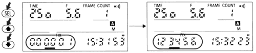 Push SEL button once to access the two left-hand numerals, twice to access the two middle numerals and three times to access the right-hand numerals. To change the numerals, push adjust buttons until desired number appears. For a blank display, set to - - (located between 99 and 00). To complete setting, push SEL button again. If you change batteries for multi-control section during shooting, the Fixed Number display will be reset to 000001.