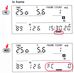 To set frame count for data imprint Push FNC button to select In-Frame or Between Frames Data Imprint function. Next, push MOD button several times until LCID shows Frame Count display.