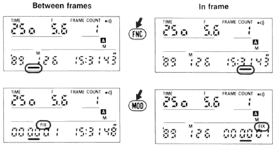 * Sequence number will not increase it film has not been loaded in the camera and advanced to frame 1. ** Sequence number cannot be reset when the MF-24's rear cover is open.Push the button to select the in-frame or between frame function. Next, push the MOD button until the LCD shows Fixed Number display. With eh display now showing, you can imprint any number form 000000-999999. This number do not increase when you release the shutter.