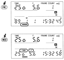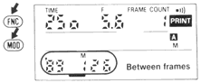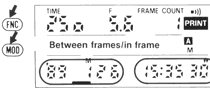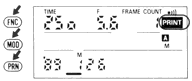 2. Select desired display using FNC and MOD buttons. Releasing the shutter while PRINT is showing causes data selected in Between-Frames and/or In-Frame Data Imprint function to be imprinted, even when the function indicator does not appear and data is displayed for other functions. If data imprint is not necessary, set to no-imprint display.