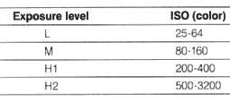 * When film with ISO speed beyond the listed range is Used, data may be incorrectly imprinted. When using B&W film (ISO 100-400), manually set imprint exposure level to L. ** When using special techniques to increase decrease image density, you can manually adjust imprint exposure by using SEL button. For a start imprint, select a lower level film speed setting that the ISO speed on the chart, for a lighter imprint, select a higher level film speed setting. After adjusting imprint exposure level, make test shots. *** For the following films, set imprint exposure level manually as listed below. **** When using special film, make test shots. test shots.