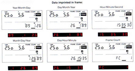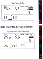 SETTING IMPRINTED DATA To Set Date and Time For both Data Imprint functions, Between Frames and In Frame, date and time can be set and displayed in the LCD. Once date and time are set for either function, you do not need to set them for the other function. (For example, if you set Year/Month/Day for Between-Frames Data Imprint, the Year/Month/Day, Month/Day/Year and Day/Month/Year displays are automatically adjusted for In-Frame Data Imprint.)