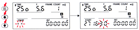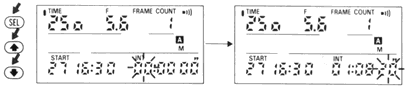 2. Set start time. Using SEL and adjust buttons, set display to desired time using the same method described for Setting date and time. To start the first shooting immediately after setting Interval Timer, adjust the left indication (Day) to - - (located between 31 and 1).