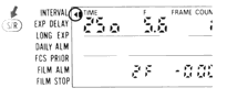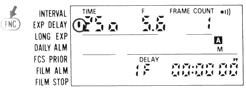 This function lets you set the amount of time before the next exposure and number of shots. To imprint data during Exposure Delay operation: Select desired display using FNC and MOD buttons, then push PRN button so Data Imprint set indicator appears. Releasing the shutter while PRINT is showing causes data selected in Between-Frames and/or In Frame Data Imprint function to be imprinted, even when the function indicator does not appear and data is displayed for Exposure Delay function.