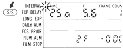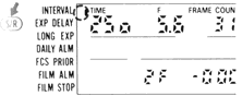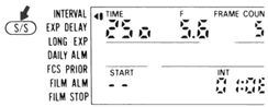The Interval Timer function lets you take a specified number of shots at specified intervals for a selected number of shootings. The maximum interval that can be set between shootings is 99 hours 59 minutes and 59 seconds, and up to 99999 exposures can be taken at one shooting. (Because the limit of bulk film rolls is 250 frames, however, the film may have to be changed before you can complete the shooting.) The maximum number of shooting intervals at one setting is 99999. Data imprinting is possible during Interval Timer operation. * When changing film, be sure to make six blank exposures before you set (or reset) the Interval Timer.