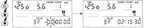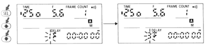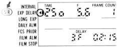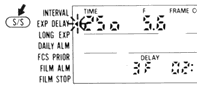 3. Set delay time. Using SEL and adjust buttons, set display to desired time using the same method described for setting date and time4. Push S/R button to complete Exposure Delay setting. Exposure Delay set indicator appears. To confirm imprinted data, push MOD button to change display, To change or cancel imprinted data, push FNC button to select Data Imprint function. Remaining time and number of frames cannot be imprinted, even when displayed in the LCD.