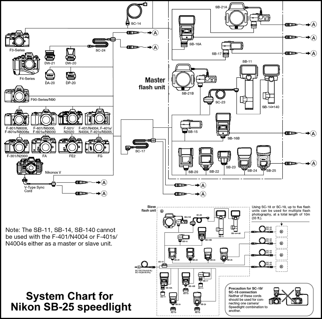 Recommended: Click to view a copy of the system chart in Gif format (95k) for SB-25 on various combination.3D Multi-Sensor Balanced Fill-Flash The highest performance possible, 3D Multi-Sensor Flash works with a combination of a Nikon SLR that offers such capability (as a rough guideline, Nikon F90/N90 onwards), a D-type AF Nikkor lens and the SB-25 AF Speedlight. In this flash mode, the SB-25 fires a series of pre-flashes that are detected by a capable Nikon SLR that equipped with such feature; then the TTL Multi Sensors will analyze for brightness and contrast. Moreover, distance information from the D-type AF Nikkor lense in use, along with other exposure control information, is integrated, thus automatically compensating flash output level so that flash output and ambient light are balanced. 3D Multi-Sensor Balanced Fill-Flash can be performed with any metering system. When a capable Nikon SLR model with such capability and a SB-25 are used with a non-D-Type AF or Ai-P Nikkor lens, (non 3D) Multi-Sensor Balanced Fill-Flash which offers the same flash output control system but without distance information and operation superior to single-sensor systems-is performed. Multi-Sensor Balanced Fill-Flash, minus Monitor Preflash, is also performed with newer Nion flash models as well as older series such as SB-24, SB-23,, SB-22, SB-20 and the MF Nikon Speedlight SB-15/16B.