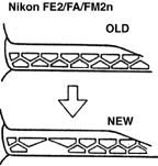 5). Modification of rivets securing the blades from December 1983 The rivets have been modified to prevent dislocation of shutter curtain blades.A good basic user education on camera care and handling should be continuously given on the careful handling of the very thinnest shutter curtains. Well, the best gift Nikon offered to such careless photographers is the decision of shutter curtain blade parts replacement as discussed earlier on the previous page. This is to save the replacement of whole shutter unit even in the case of shutter curtain breakdown, spare curtains are made available with this decision.