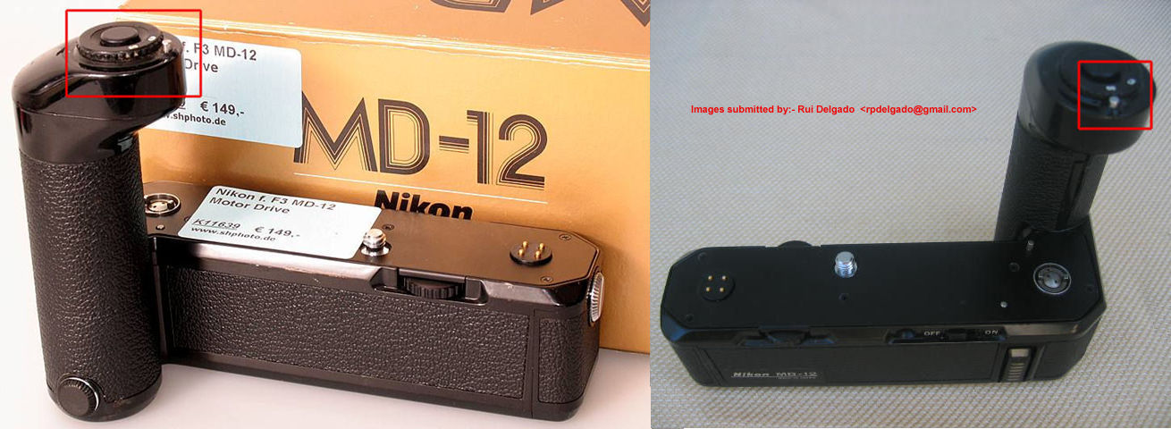 " ... I been browsing your site for about 4 years now. Its a great site a really good reference for collectors. Anyway, I was wordering if you can help me. I found 2 different MD-12 motor drives. The first I will called it the drive in the normal position. and the second one the one where the top right is "pointing" towards the camera ( if fitted ) and not to the left as I always saw them advertised. Can you explain this ? I guess something is not right on the second one, and I consider it as a broken unit. Notice that the little rubber square is poiting outside.... please see pictures. Thanks and once again rellay great site. Lots of info. Thanks..." . - Rui Delgado -The MD-12 is indeed a very reliable motor winding device, structurally it has a robust aluminum alloy metal and beneath its leather cover, it is treated with another layer of hard anoylised black paint. Hardly needs any maintenance and seldom casts any problem in operation. Well, this drive can fit into any of the cameras mentioned earlier, it is always in hot demand, selling it off after 10 years of heavy duty usage may not even hurt your pocket too much either. Lastly, if you are a owner of Nikon FM2n, there is a third party alternative slower Power Winder manufactured by Soligor for you to consider (NOT useable with FM and Nikon FM3a). Update: Another Alternate by N.I.C. Power Winder for your Nikon FM2, FE2 and Nikon FA