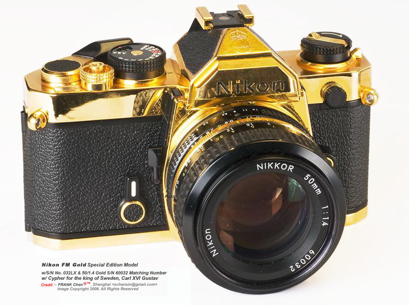 Note: This is a Nikon FM Gold, with a serial No.032LX gold plated, coming with Nikkor 1.4/50mm No.60032 (matched to the body number). Provenance: With the cypher for the king of Sweden, Carl XVI Gustav. - Frank Chen, Shanghai, PRC.