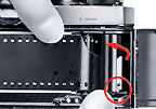 10. Insert the film leader in the take-up spool. Pull the leader across gently and insert it into one of the slots in the film take-up spool. Slowly rotate the take-up spool inwards with your thumb, making sure the latch in the slot engages the first or second perforation along the side of the film leader.