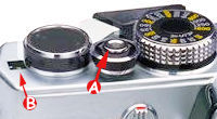 The shutter release button (A) is threaded in the middle (JIS approved screw-in type) to accept standard cable release which may be required in situation where you need absolute stillness for long time exposures. If exposure time is exceeding more than a few seconds, it is always encouraged to get a cable release with a lock feature.If you are worrying about movement caused by reflex action of main reflex mirror, use the mirror lockup of the OM-1 to minimize such chances. The shutter release button is quite sensitive, require only around 200-300g force to trip the shutter release. None of the OM-1 bodies were provided with any shutter release lock. However, once the shutter has been release, it will not be able to trip further. Upon completion of the film advance action, the shutter can be released (Or via shutter release button on top of the hand grip of the Motor Drive). Other than that, the shutter release button may be pressed in only about 0.05-0.15mm but not for the full stroke. The film advance lever on the other hand, should return to its original position regardless of whether the film is loaded or not. As a guide, In its still position, the lever should be in contact with the ASA dial or within 0.8mm from the dial. On the left hand side of the pentaprism is the large and easy to use Meter ON/OFF switch lever. Basically, switching it to ON initiates the flow of current from battery and activates the meter needle inside the viewfinder.