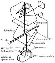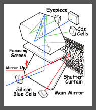 Another advantage is, as you can notice, the OM2(n) has no eyepiece shutter incorporated Because Olympus in the opinion that the TTL Direct Light Measuring Method excludes all possibility of stray light leaking through the camera eyepiece and distorting the exposure reading, because the reading is made during the exposure, when the mirror is in the raised position and automatically cuts off all light from the eyepiece. What about the twin Cds cells reside near the eyepiece ?Wouldn't it be affected say, with the camera set at AUTO, facing downwards with the eyepiece exposed to bright sky or strong sunlight ? Possible, but the reading provided by the Cds is merely used for viewfinder exposure display and not the actual film taking aperture used which handles by the SBCs and thus, it is not affected. The two light sensitive SBC *(Silicon Blue Cell) sensors that measure light reflected directly off the actual film, this method bypasses the mirror completely, to permit light measurement during the period the film is being exposed. Even there are changes in the light levels, the metering cells will respond instantly to changes in the light intensity during exposure, and feed back the information on real time to the shutter control mechanism. The system is somehow different from using memory circuit first designed by Pentax to store the data prior to exposure, the system is still widely used in many today's conventional electronically controlled cameras.