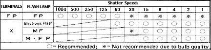flashbulb Photography [1] Mount the Accessory Shoe to the camera and insert the shoe mount of the flash unit into the Accessory Shoe. * If your flash unit does not have a "hot shoe" contact, plug the flash unit's synchro cord into the synchronizing socket. [2] Set the camera's selector lever to the "MANUAL" position. [3] Select the proper shutter speed and synchro setting from the table below according to the type of bulb being used and make these settings on the camera. . [4] Determine the correct F stop for flash exposure by using the guide number formula. * The guide number for any flashbulb/film combination may be found on the flashbulb packaging. [5] Set the correct F stop with the camera's aperture ring.