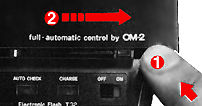Preparation and Setup: With the calculator panel in the 'full automatic control by OM-2' position, turn the power switch to the "ON" position. Set the camera's selector lever to "AUTO".