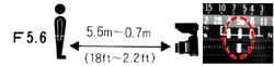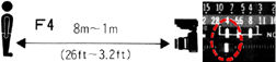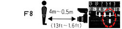 Set the flash to "AUTO" (3 f/stop positions). Align the white line I with either one of the F numbers indicated by the I mark.