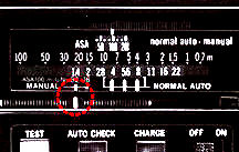 (2) ASA/ISO Index Mark (3) ASA Switching Knob Slide the scale in one direction or the other in order to set the ASA film speed. The number will appear in the ASA Window. (4) Aperture Scale(5) Mode Switching Knob Slide the switch to MANUAL or AUTO. (There are three AUTO positions and two MANUAL positions.) Set it at the desired click-stop position to decide the mode of photography.