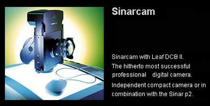 The Sinarcam 1 combines a digital adapter for the Sinar view camera system. The focusing image can be viewed on the computer monitor as a high-resolution live-video image of any desired size. In combination with the Leaf Volare digital back. Its universal adaptability features the possibility of quickly and easily converting the compact camera into a professional camera (by attaching it to a Sinar P2 Camera). The adaptation principle permits attachment of lenses from a great variety of manufacturers via a lens adapter board(s) where each board caomes with automatic springloaded aperture control (auto) automatically stop the lens down to the preselected working aperture when the live focusing image is turned off, Other than Sinar's own Sinaron Digital lenses in DB mounts (with the Sinar p2 view camera), the Compact version of the camera can also be used with lenses from Nikon, Olympus, Leica R or even the medium format lenses from Hasselblad & Mamiya 64 (rerquires a special shift board that provides the compact version of the Sinarcam with the capability of perspective correction). The Leaf Volare Digital Back produces images with a resolution of 3,072 x 2,048 pixels at a color depth of 14 Bit per color (16,384 gray tones).