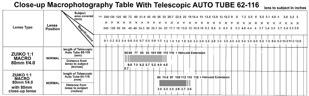 Among the three macro lenses introduced during the early days, the most interesting optic was the Zuiko 1:1 Macro 80mm f/4.0. Generally, ordinary lenses and conventional macro lenses cannot reproduce life-size images with critical definition, while this was the world"s first 1:1 macro for use with 35mm film. Although I am not sure whether the original OM system introduced with the M-1 has this macro lense available, but even by the time OM-2 was introduced in 1975, at the time, it was till the world's first application macro lense to offer life size reproduction. The early version works in full manual operation and exposure measurement was done only in stopped down metering. it was specifically designed to work extensively with the Auto bellow unit only. Especially for life size copy work, the 80mm f/4 is an excellent lense in particular used with a Telescopic Auto Tube introduced at later stage where its magnification range is 1/2x to life size, or life size to 2x together with the Close-up Lens 80mm Macro. Low magnification close-up photography is also catered for with auto extension tubes and close-up lenses. The manual preset lense weighs heavier (200g versus 170g) and measures longer (46mm versus 33mm) than newer version. With the auto bellow, the highest achievable magnification ratio can be 2.4X.Credit: Mr. Steve Martin <stevemartin@hetnet.nl> who contributed his time to prepare the scanning process of the Instruction Manual of the Auto Tube 65-116mm.(NEW upload)
