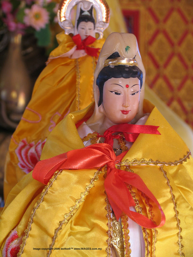 There are two installation of images with Buddhist interest at the right hand side of Wat Chaiyamangalaram. Both are considered to be "popular" forms within the Chinese Buddhist community - One is a Four-Faced Buddha and another is a Kuan Yin. Along with the new Buddha temple at the left hand side, the Kuan Yin Image was housed at the right hand side, each serves to compliments the center section where the main Reclining Buddha Image locates. These various Kuan Yin images from large to mid-sizes are very presentable and in fact, I am kind of surprise to see its details (click on one of the image for an explosive view below).