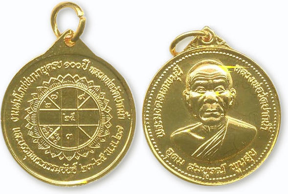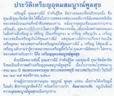 This was officially produced in BE.2527 (1984) along the dream of Khun Saowanee. In the dream, she was in the main hall of Wat paknam and met Luang Por Sod there. Luang Por Sod has given her this medal and called "Udom Somboon Poonsuk" which means extreme wealth. She was then producing this medal of her dream to cerebrate 100 yrs old of Luang Por Sod in the year 1984....". - Thanin -