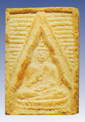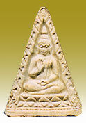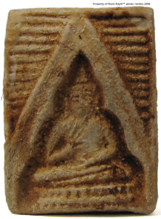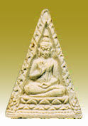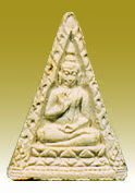 The fourth generation of wat Pak Nam images is more popular due to a few reasons: First, it was more affordable to public. Secondly, other than basic ingredients, the fourth batch actually mixed with broken or reject pieces of the first, second and third batches during production. Strangely, people that I talked to was more fond of either the first or the forth generation of Wat Pak Nam. Except for other reasons that leads to its popularity, there are few significant issues with the forth batch: Firstly, it is made larger than earlier third batch, the mold has seemingly being designed to be perfected to enable to go for mass scale production and the images are clearer in its various detailed texture Next, this batch was probably the first that provides a variant in a triangular shape alternative (as well as a rare pieces of precious stones applied onto (at the rear section). Between the standard production unit, there is a variant which has a "Por" Thai inscription where some other added ingredient were added onto which make the "Por"version fetches a higher value than standard rectangular and triangular versions. Some collectors said the triangular shape of Wat Pak Nam were meant more for women users but I find this hardly convincing. Further, there are probably few groups, separates between the used of molds (like new faced, old faced, cracked mold version and even without script imprinting at the rear section etc.) Well, the only triangular shaped WPN I used to own was given to my sister in law (see the image at the lower section) and she deeply believes in it for her smooth professional carrier advancement. Perhaps, one last issue was, most people think it was also the last batch that has enjoyed the blessing of the late great Guru Monk. I was told by uncle Wichien that the fourth batch actually has another variant in the classic rectangular form where every 250 pieces in production has a slightly smaller version where it has a different designation (see above for one of the (center image, currently version I had was also similar to this).
