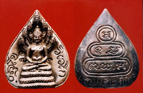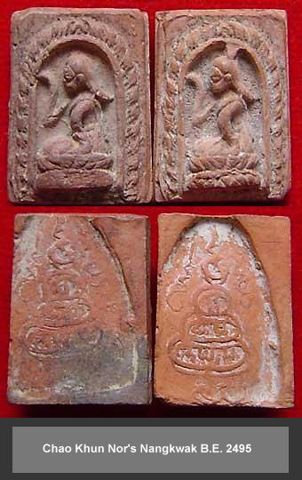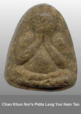 One key attraction of CKN's images is, they have managed in successfully blending traditional creations of religious amulets with native Thai Buddhist art. The designs, with many popular Buddhist figures, come in various forms, size and even the choice of materials used. Naturally, each one bears a similar stamp at the rear section. In fact, many of his creations can be treated as a decorative art on its own which also partly contributes to its popularity. The "rubber-stamp-like" emblem which probably used during the early days have evolved in many artful presentations at later stages. Despite all the talks of CKN images, but there ain't many you can find them as you would expect it to be - simply because the name "Chao Khun Nor" itself is rooted deeply as synonymous with "rarity", "class" and "appreciation". and highly treasure as collectibles by Thai public. However, with a stroke of luck, I managed to get help from a collector from Singapore who has developed a keen interest in collecting images produced by CKN. I have got his belssing and permission to compile them orderly and showcase them here in this site. Thank you so much, Brian/Steven.